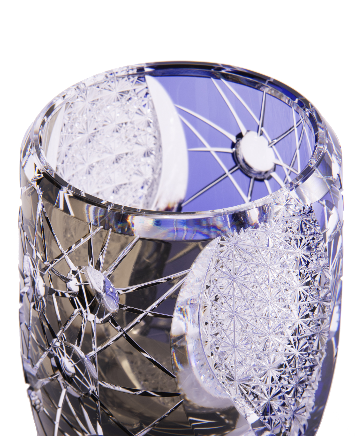 左右で異なる色を使った 世にも珍しい二色被せガラス 惑星のような深い玉カットの中に宇宙空間の 無限の広がりが映り込みます